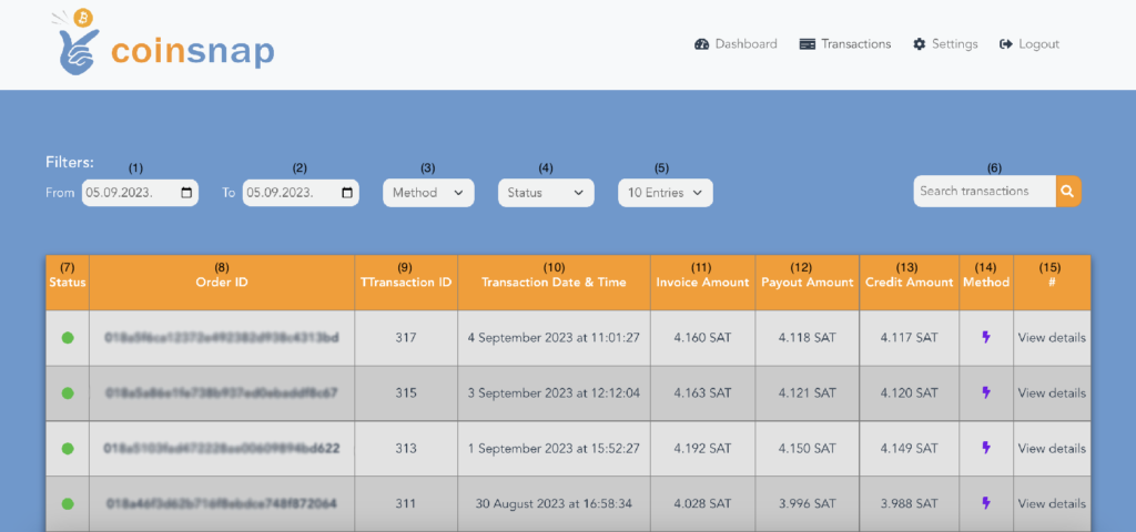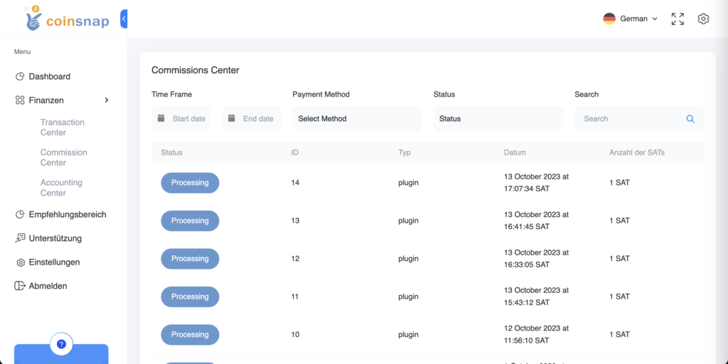 Im Coinsnap Backend findest Du weitere Einstellungsmöglichkeiten für Coinsnap und alle Informationen zu getätigten Umsätzen und Abrechnungen.