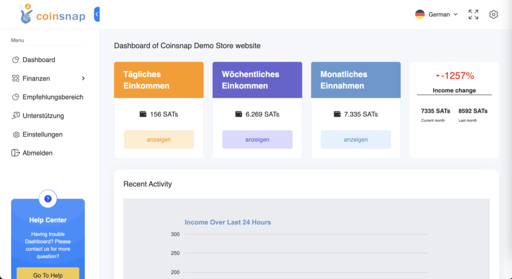 Das Coinsnap Dashboard wird Dir danach immer angezeigt, wenn Du Dich in Coinsnap einloggst.