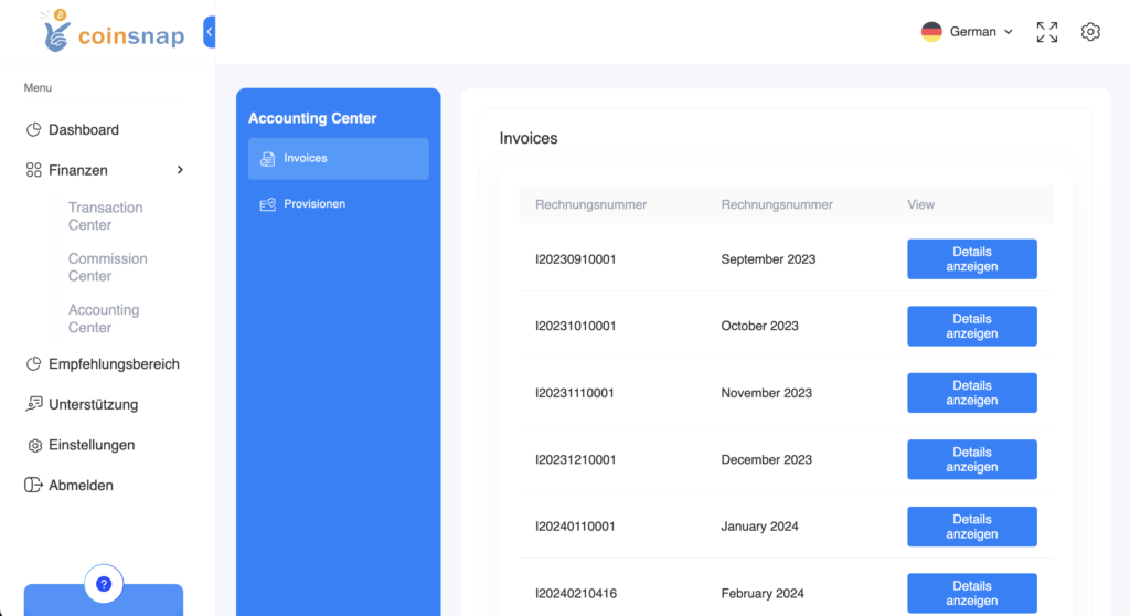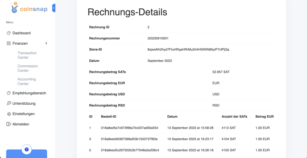 Im Bereich Abrechnung finden Sie die Auflistung der monatlichen Rechnungen für die von Coinsnap erbrachten Leistungen.