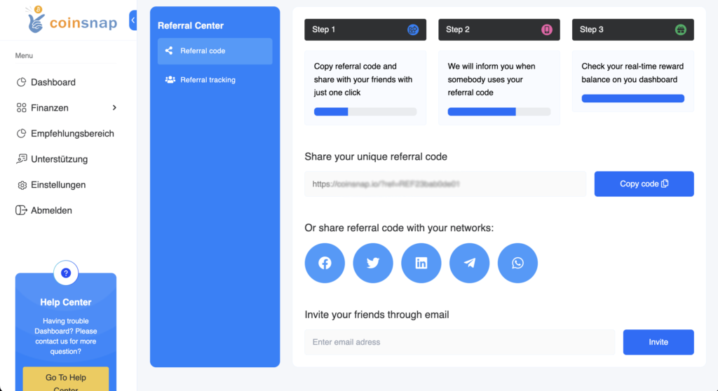 Deinen persönlichen Referral Link findest Du unter Einstellungen und dort im Bereich Referral. Wird über Deinen Link ein neuer Coinsnap-Kunde gewonnen, erhältst Du eine Provision in Höhe von 0,25% des getätigten Umsatzes.