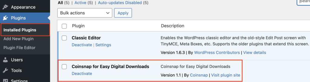 Nachdem Du die ZIP-Datei erfolgreich hochgeladen hast, navigiere zum Abschnitt „Installierte Plugins“ und stelle sicher, dass das Plugin „Coinsnap for Easy Digital Downloads“ aktiviert ist.