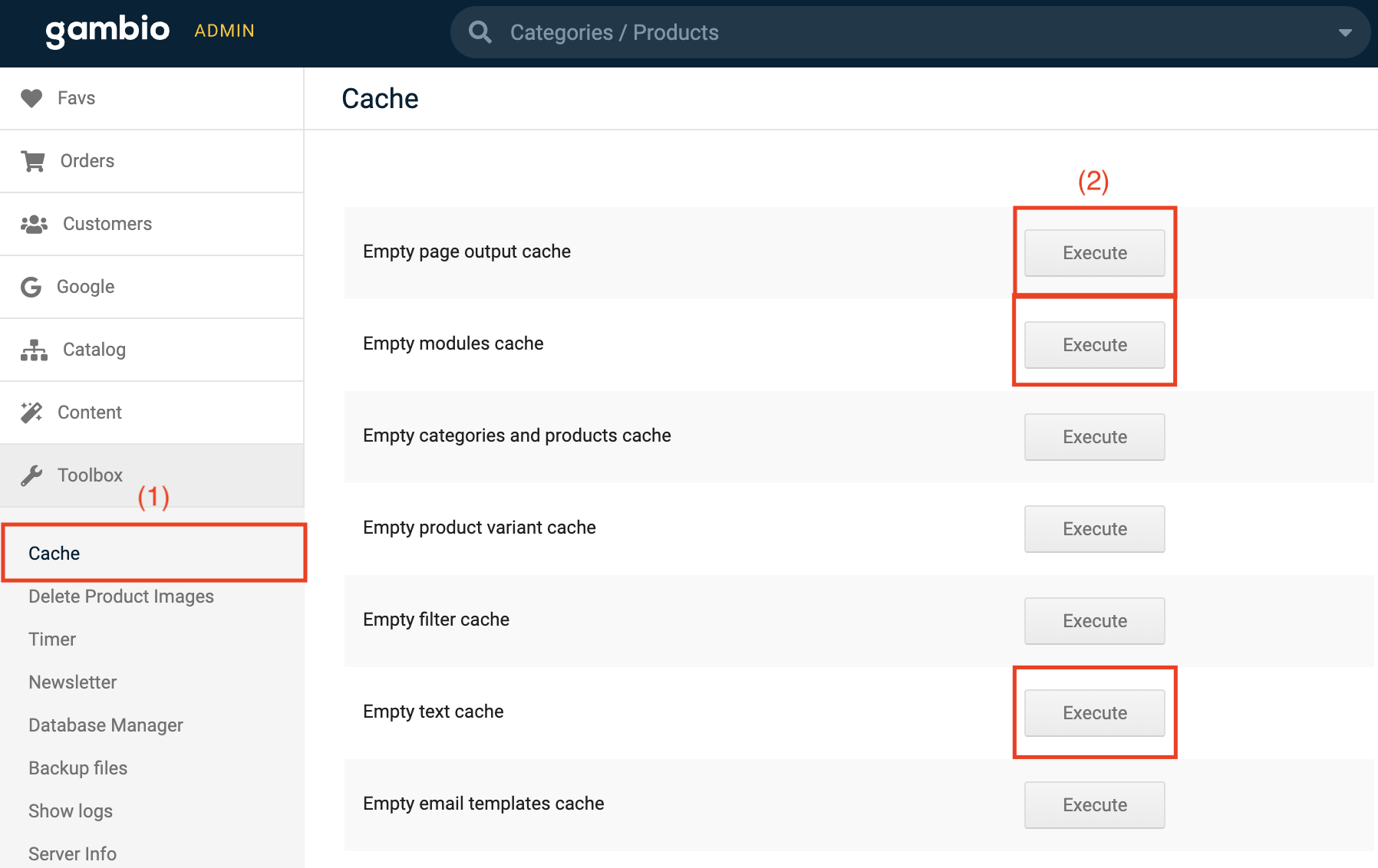 Kehre nach erfolgreicher Installation zum Cache-Bereich zurück und löschen Sie den Modul-, Ausgabe- und Text-Cache erneut.