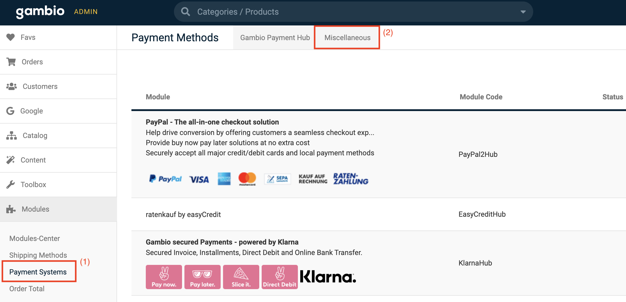 Navigiere zum Abschnitt „Module“ -> „Zahlungssysteme“.
