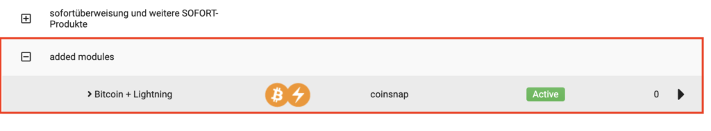 Scrolle zum unteren Ende der Seite, wo Du den Abschnitt „Hinzugefügte Module“ findest. Klicke auf „Bitcoin + Lightning“, um die Installation der Zahlungsmethode „Bitcoin + Lightning“ zu starten.