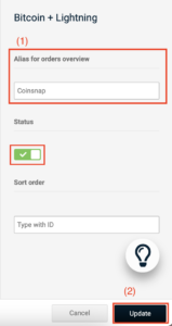 Gebe im Feld „Alias für Bestellübersicht“ „Coinsnap“ ein und aktiviere die Zahlungsmethode.