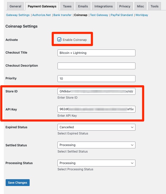 Unter Activate setzen wir das Häkchen, um Coinsnap als Payment Gateway zu aktivieren.