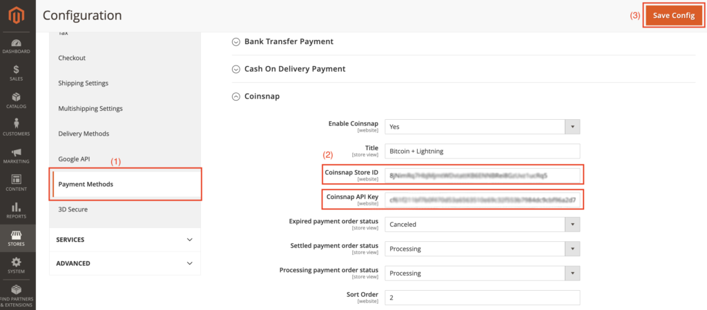 Gebe die Store-ID und den API-Key, die Du zuvor aus der Coinsnap App kopiert hast, in die entsprechenden Felder ein.