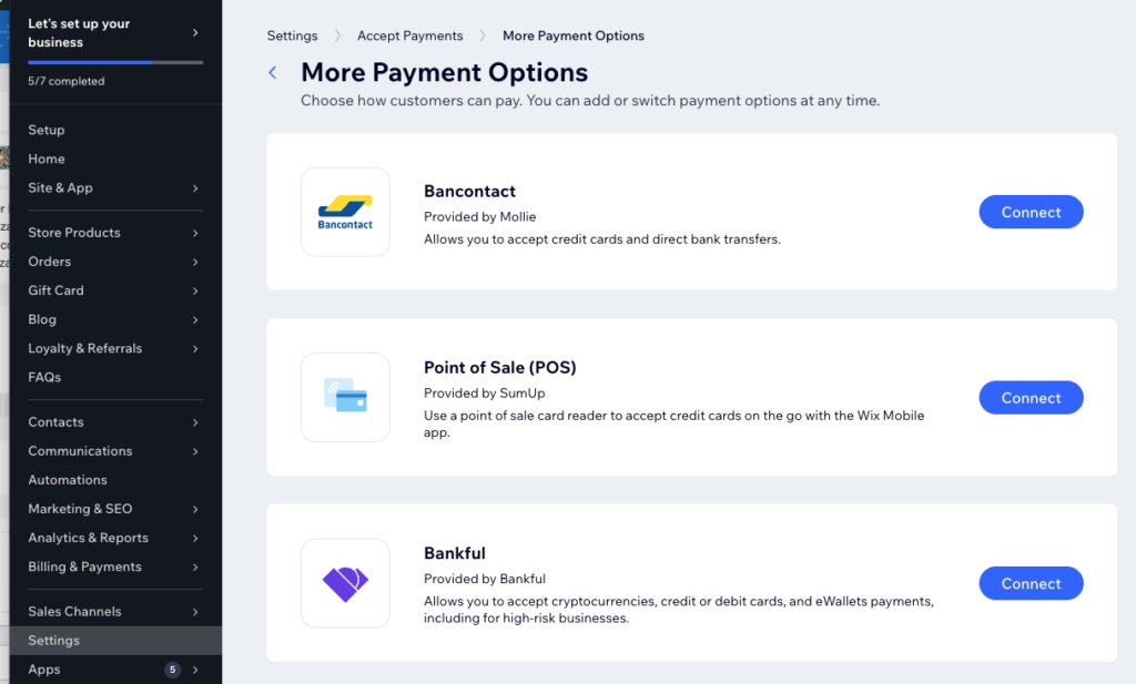 Die Seite Accept Payments listet die Payment Gateways auf, mit denen Du bereits verbunden bist. Um Dich mit einem anderen Payment Gateway zu verbinden, scrolle bis zum Ende der Seite. Dort findest Du den Menüpunkt „See more Payment Options“.