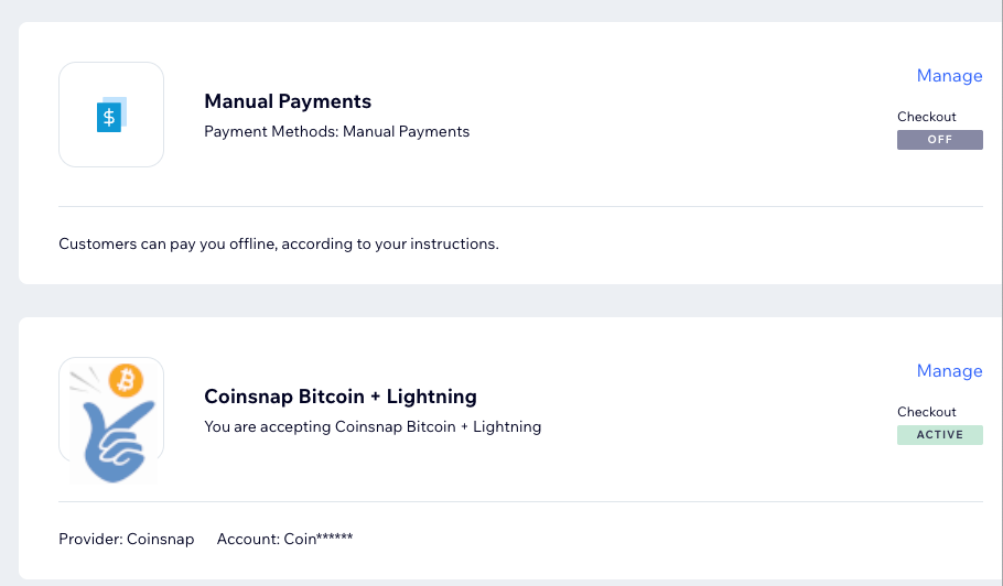Coinsnap wird nun unter den Connected Payment Gateways aufgelistet. Klicke auf Manage, um die individuellen Einstellungen vornehmen zu können.
