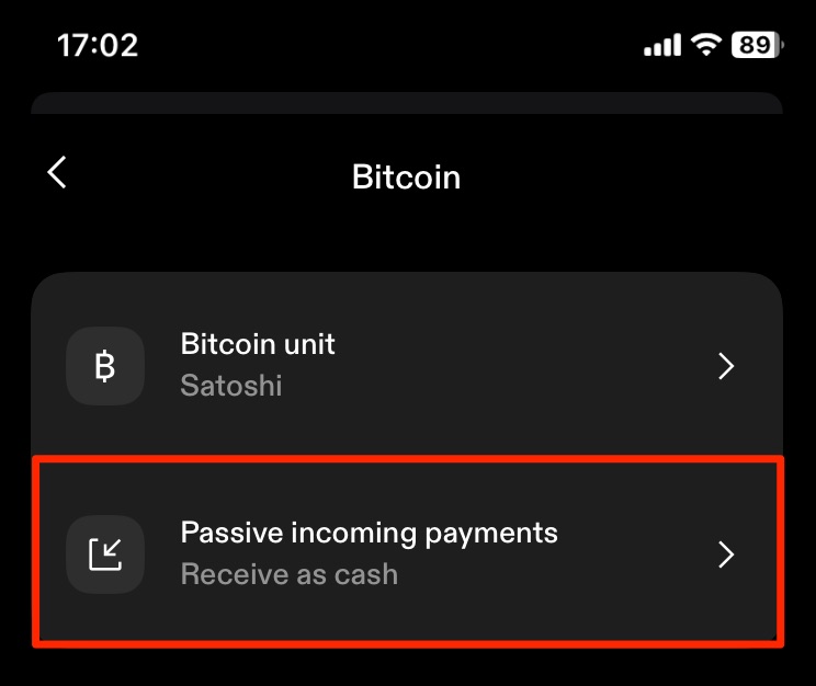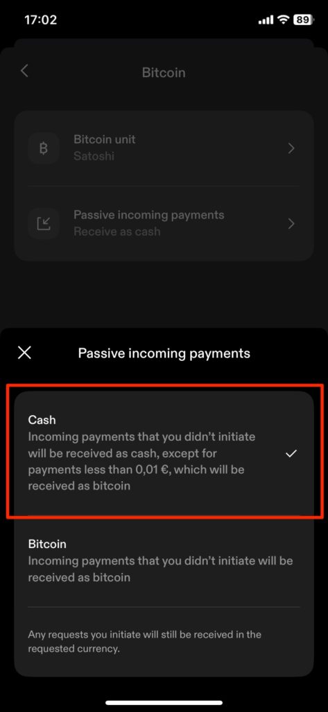 Здесь можно выбрать способ зачисления платежей, которые вы не инициировали сами. Платежи на ваш Lightning-адрес могут быть отправлены вам кем угодно и, следовательно, не инициированы вами. Соответственно, вы можете выбрать, будут ли они зачислены на ваш Cash или Bitcoin Wallet.