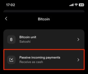 Для этого мы прокручиваем страницу вниз до раздела «Настройки» в области «Профиль», где также отображается наш адрес Lightning. Там мы находим подпункт Bitcoin, выбираем его и находим пункт Passive Incoming Payments.